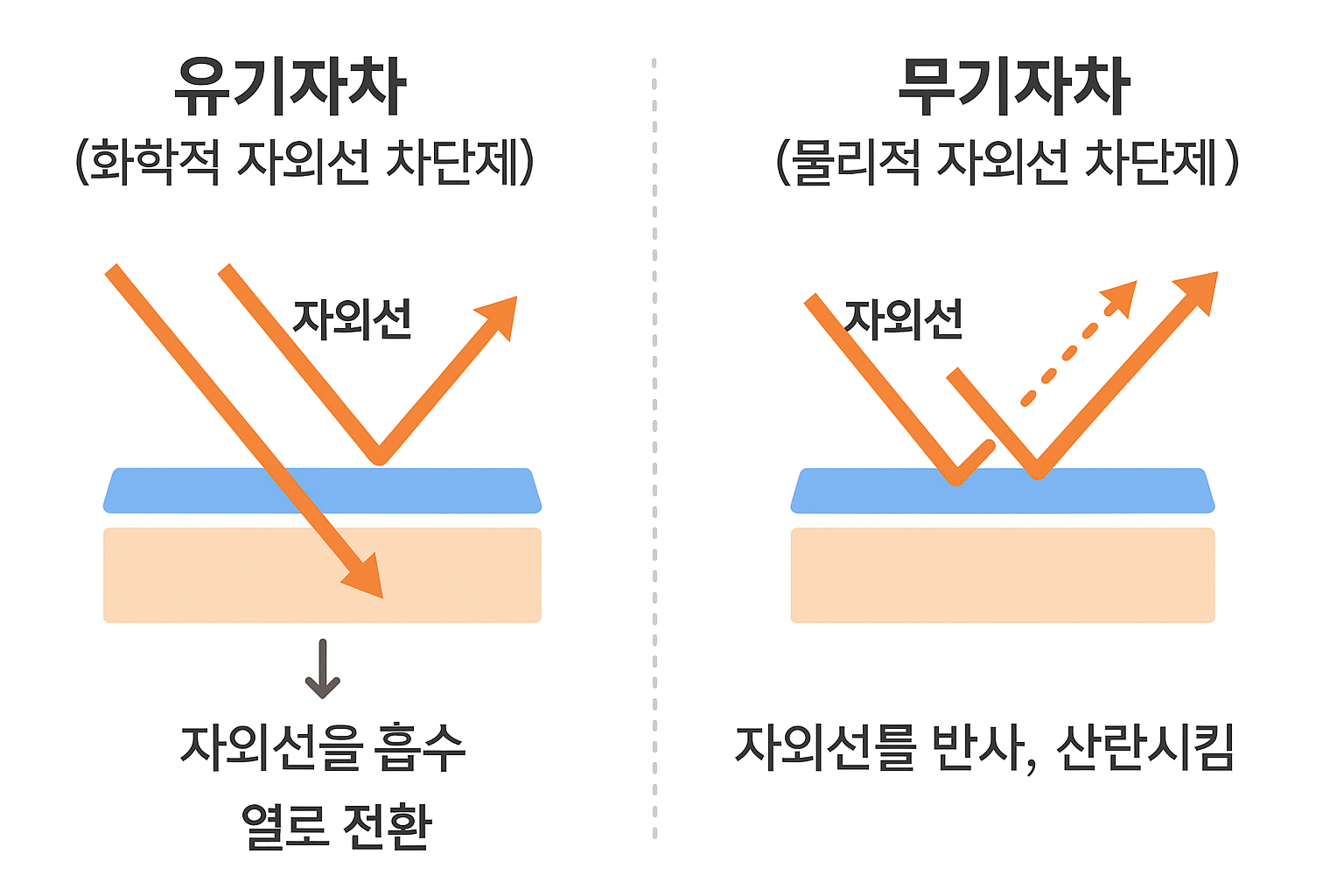 | 차단 원리 | 자외선을 흡수 → 열로 전환 | 자외선을 반사, 산란시킴 |