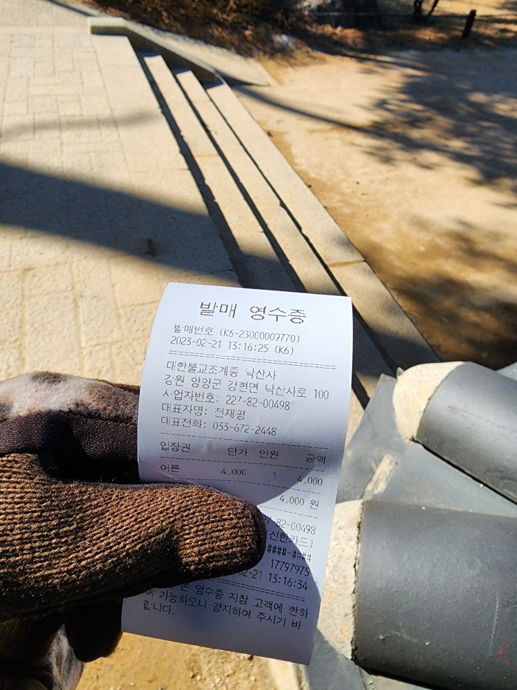 낙산사 문화재구역 입장료는 어른 4,000원 / 중. 고생 1,500원/ 초등학생 1,000원입니다.
