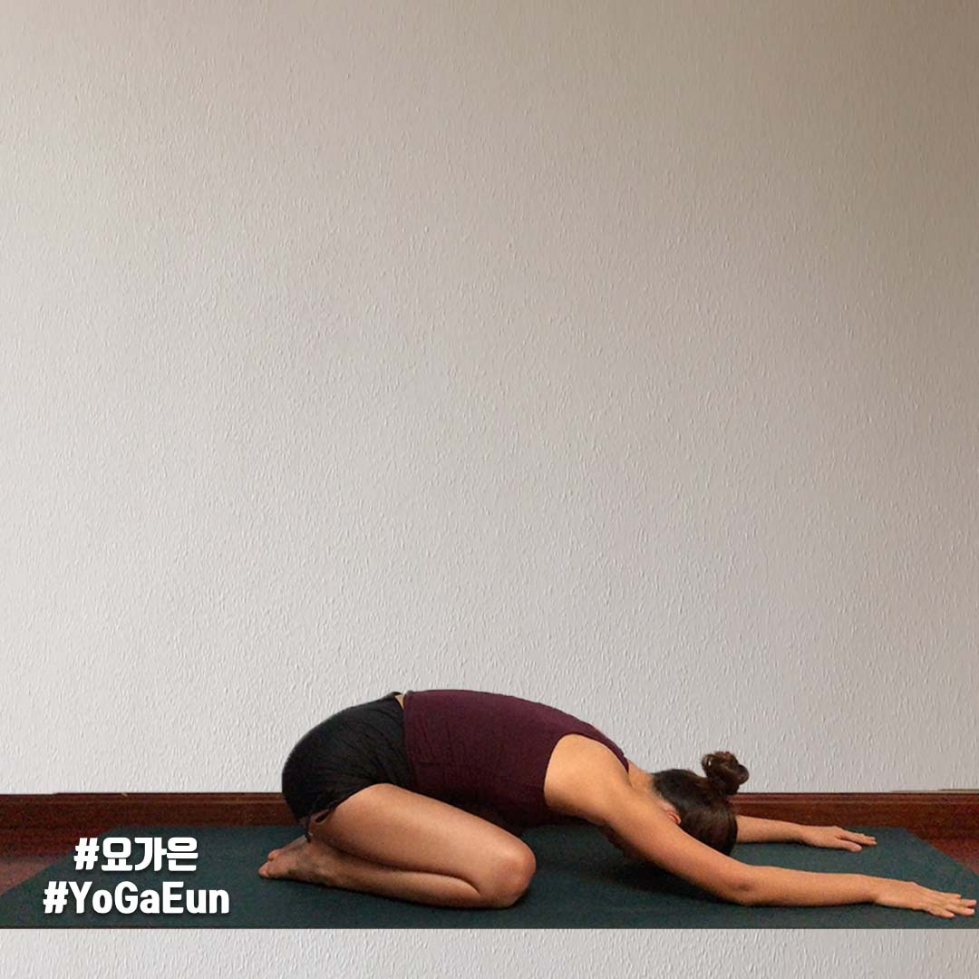 무릎을 꿇고 상체를 앞으로 숙이는 자세는 복부를 압박하여 소화 개선과 복부 긴장 완화에 효과적인 요가 동작입니다.