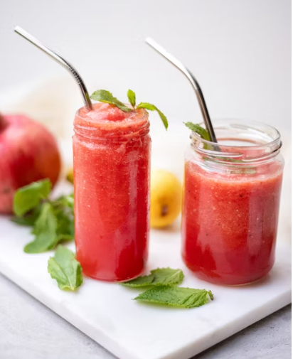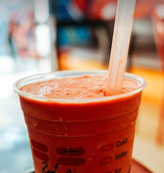일반 수박주스보다 진하고 달며, 얼음을 많이 갈아 넣어 쉐이크처럼 마시는 것이 특징이에요.
