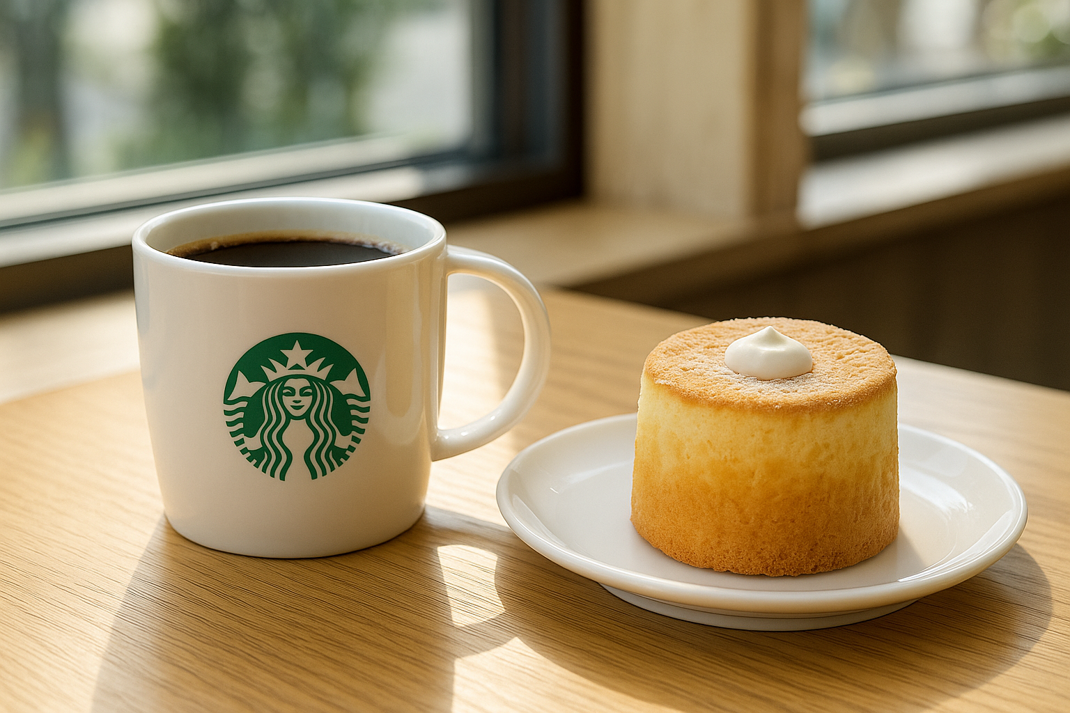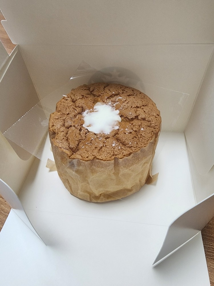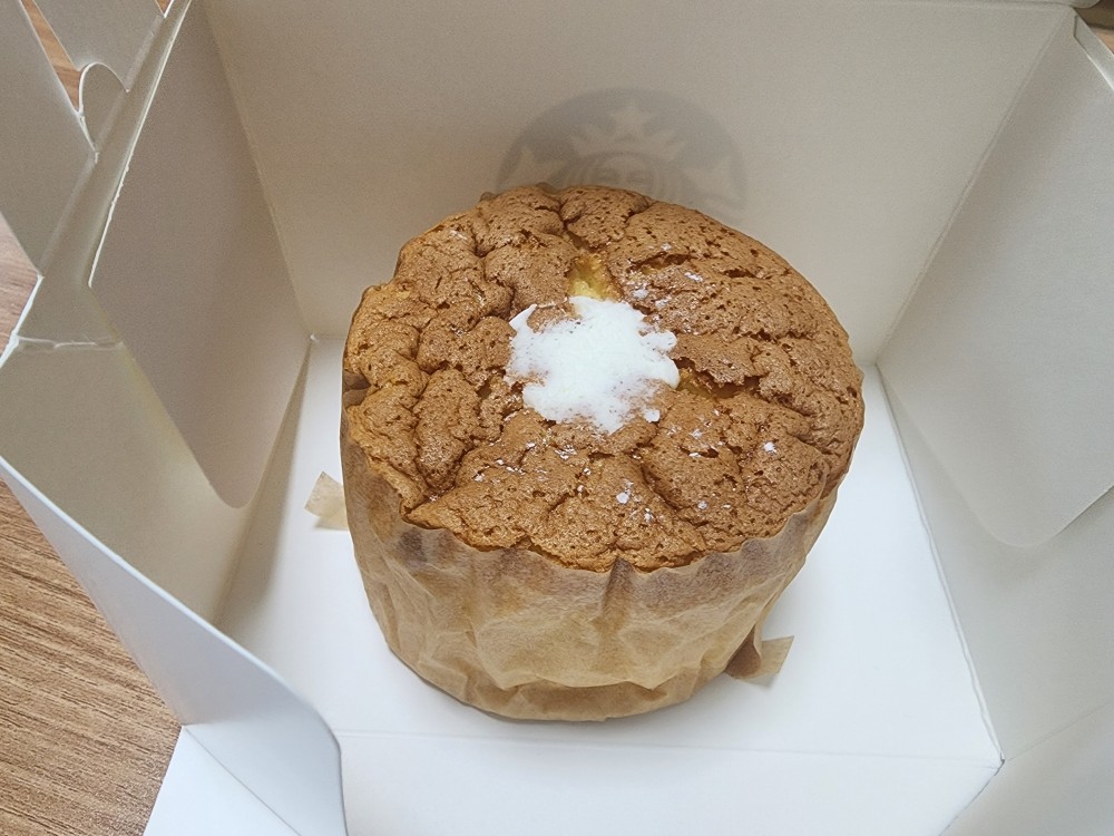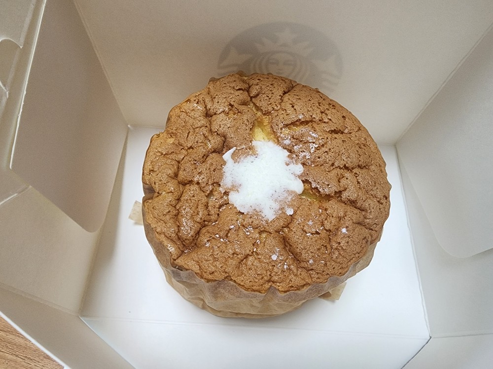 저는 스타벅스 카스테라를 집으로 포장해와서 먹어보았어요~!! 처음 받아보자마자 도톰한 원통형 카스텔라에 하얀 슈가 파우더와 크림이 콕 올라간 모습에 감탄했습니다. 겉은 부드럽고 결이 고운 스펀지 느낌, 마치 고급 수플레 케이크처럼 폭신해 보였어요.