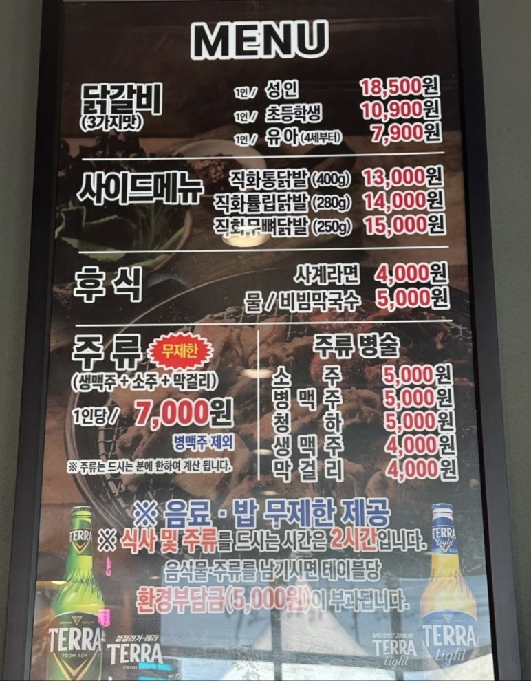 - 특징: 숯불에 구운 닭갈비와 함께 다양한 사이드 메뉴를 무제한으로 제공하는 곳입니다. 가성비가 뛰어나며, 가족 단위 손님에게 인기 있습니다.