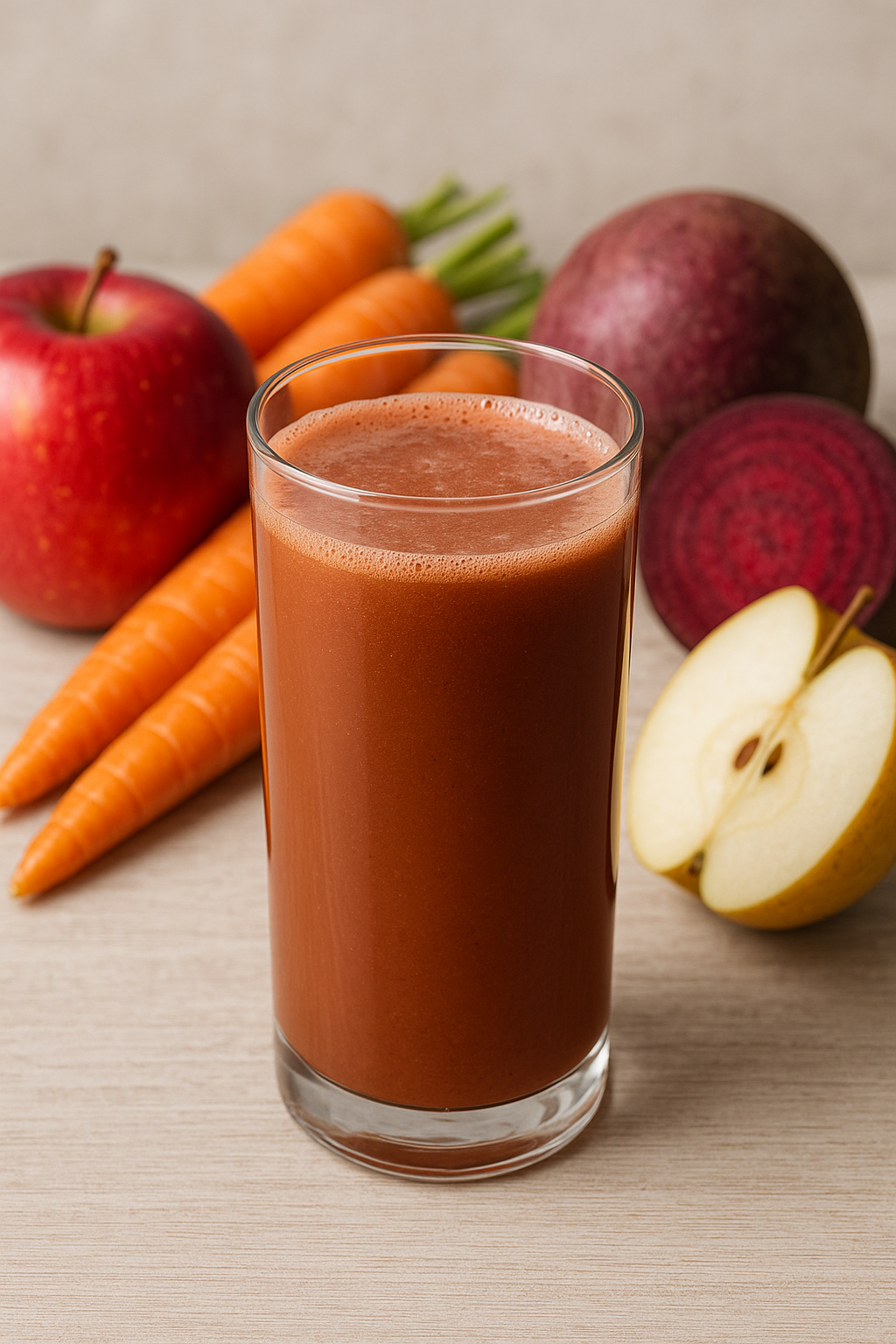 ABC주스란 사과, 비트, 당근을 1:1:1 비율로 갈아 만든 생즙입니다. 풍부한 식이섬유, 베타카로틴, 비타민 A·C, 철분 등으로 인해 피부 개선, 해독 작용, 면역력 강화, 변비 해소, 다이어트에 도움이 된다고 알려져 있습니다.
